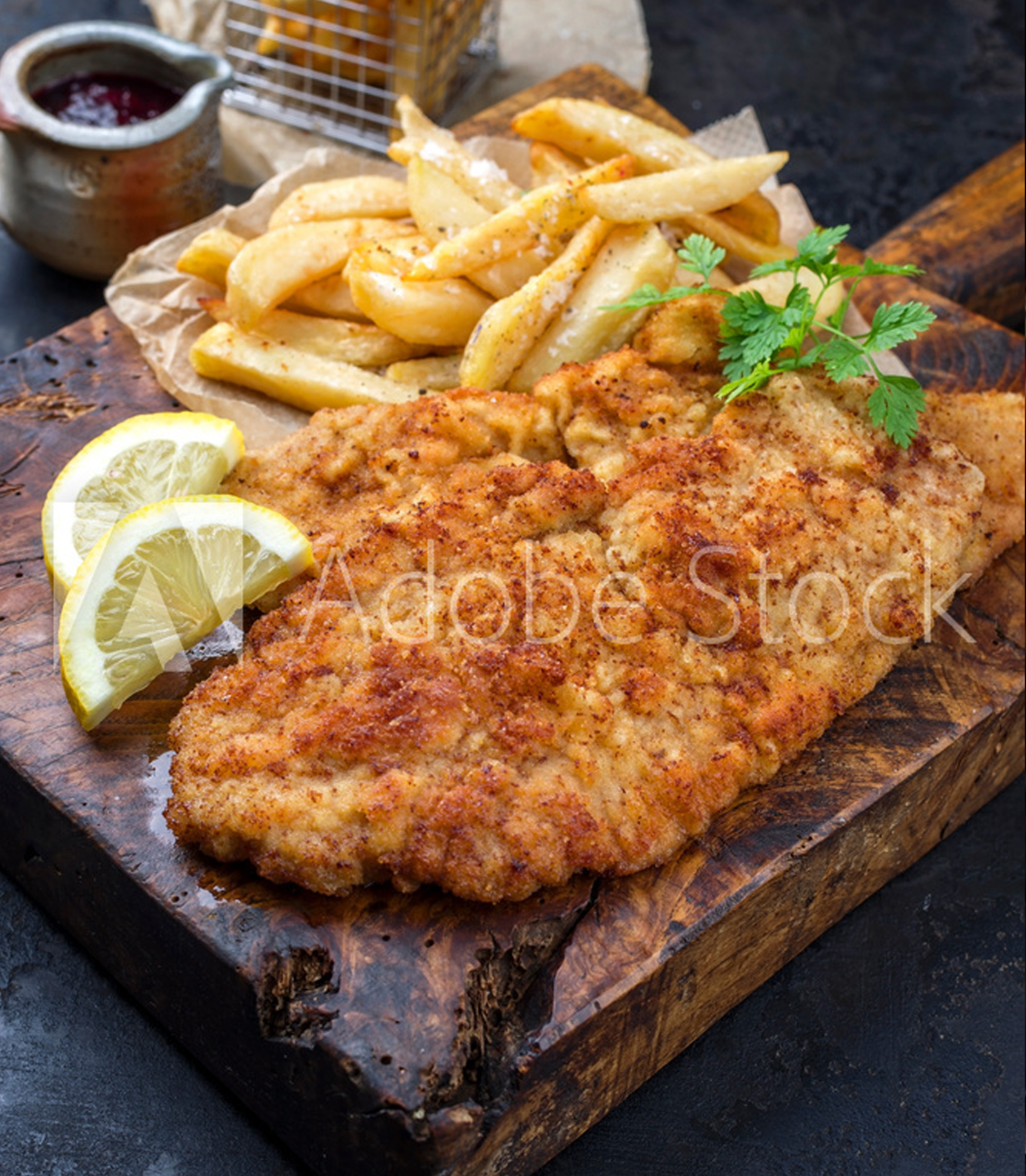 Schnitzel mit Pommes Frites, dazu wird ein Salat gereicht